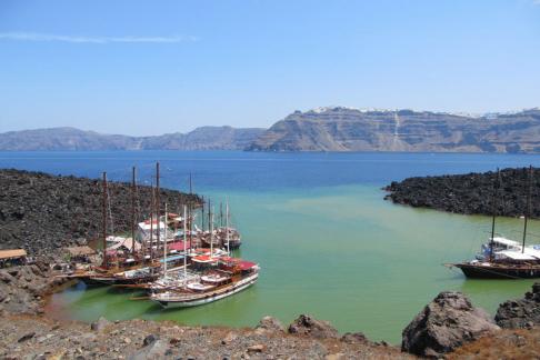 A boat trip is an excellent way to spend a day. First is a visit to the lava island of Nea Kameni. You can hike to the top of the island to walk around the crater, the volcano is still active. You can then swim in the in the green sulphur waters of the hot springs in the sea next to the island. One word of warning though, your swimwear may be a different colour when you come out.
